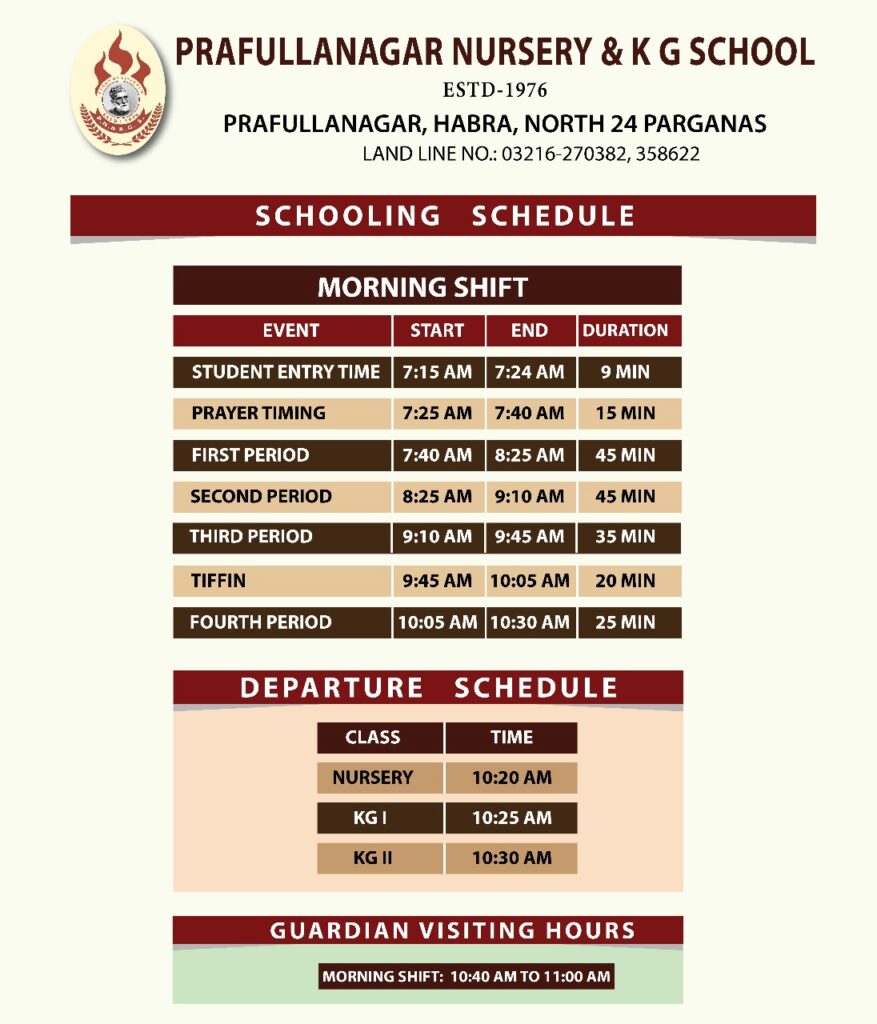 Prafulla Nagar Nursery & KG School is Operational from Monday to Friday, with Saturdays and Sundays off.
